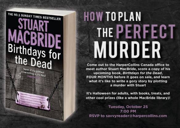 Dear Harper Collins Canada: I love you! Thank you for bringing all these awesome crime, mystery and thriller writers to Toronto and for hosting fan events with them! First Peter James, and now Stuart MacBride. Do I dare hope for a Val McDermid, Martin Walker or James Rollins event on the horizon?