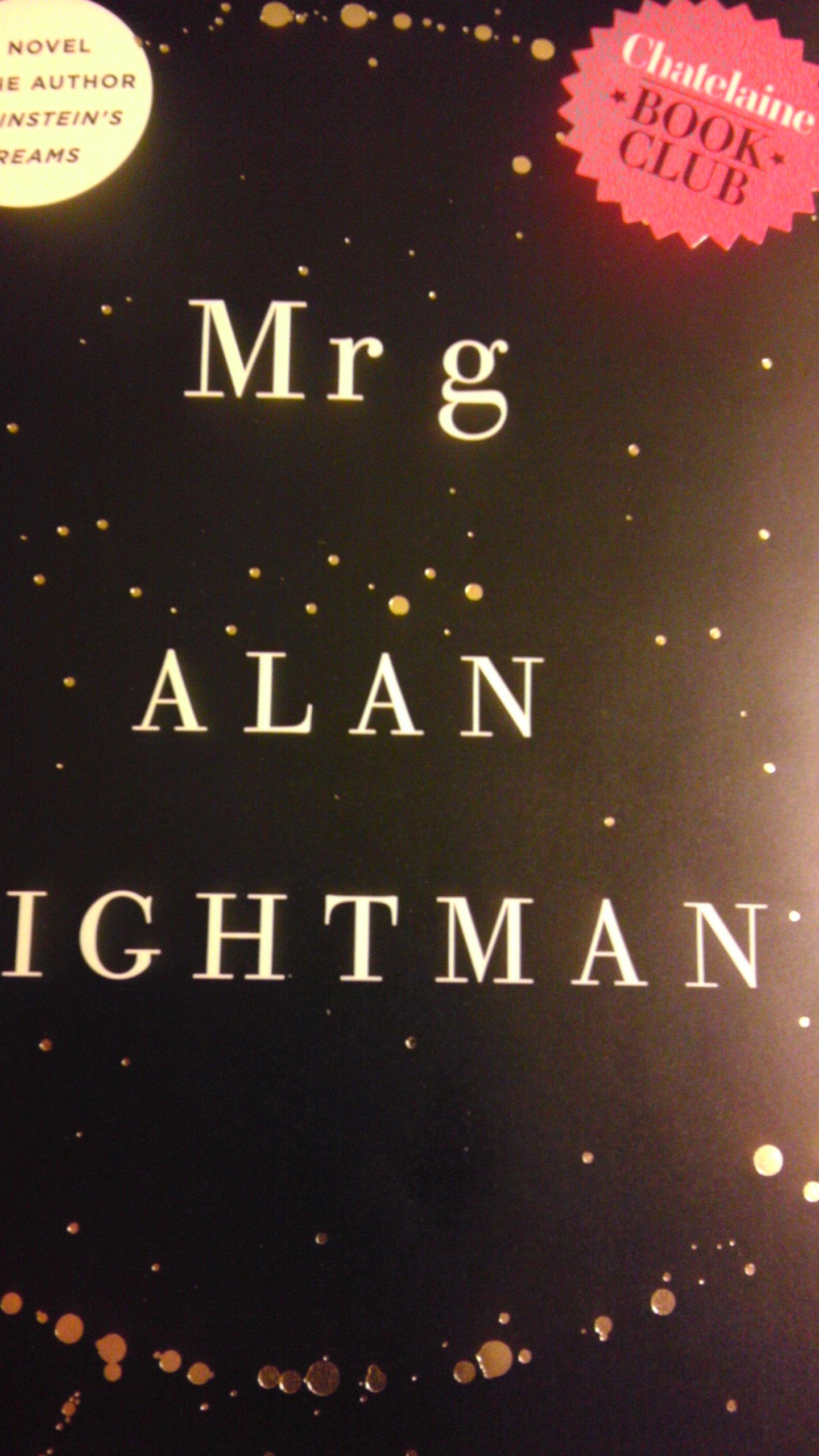 Chatelaine was also kind enough to provide each of us with a copy of Mr g. I absolutely love the cover! The original cover, above, is already beautiful, but our copies have the bright pink Chatelaine Book Club label on it, which I think makes the book even more eye-catching. (I took this image with my phone and the lighting is off; it’s much sharper in real life.)