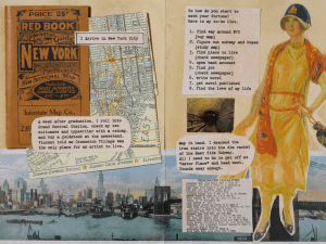Scrapbook is also such a romantic novel! The question of whom Frankie will end up with isn’t too difficult to guess, but the relationships she forms are all so fascinating. Again, the scrapbook format enhances the romance. Images of dapper men in suits, of love letters, movie tickets and telegrams all work together to create a lush, evocative world, where a gentleman can come knocking at your door or a rogue can invite you for a spin in his brand new automobile. The scrapbook format also softens the edges of emotion. When a man breaks Frankie’s heart, we know this because of a couple of photographs and a few typed lines, over a two-page spread. Frankie has a great sense of humour, and so another painful experience is countered by a lighthearted image from a magazine ad. It is almost too easy to miss the pain behind these images, and the book forces us to stop at moments and discern all the layers of emotions revealed by Frankie’s choice of memorabilia.