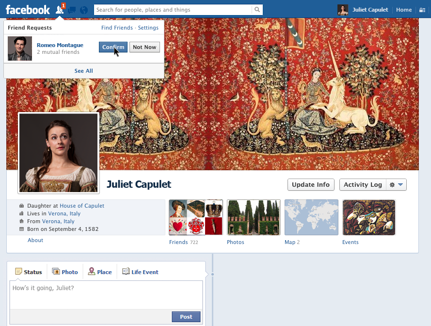 That being said, Romeo and Juliet is the perfect play to play out on Facebook. Can you just imagine a modern day teenage Romeo sending a modern day teenage Juliet a friend request?