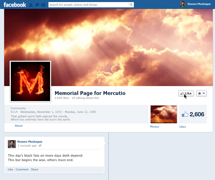 Or a Memorial Page being set up for Mercutio? He was, apparently, a very popular guy. (2,606 likes!)