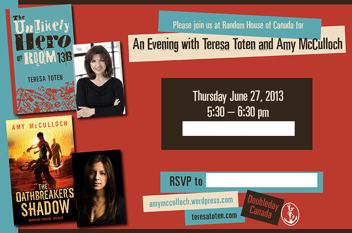 When I received this invitation from Random House of Canada, I had just recently read Amy McCulloch’s The Oathbreaker’s Shadow and had absolutely fallen in love with it. So I jumped at the chance to meet her, as well discover a new (to me) author Teresa Toten.