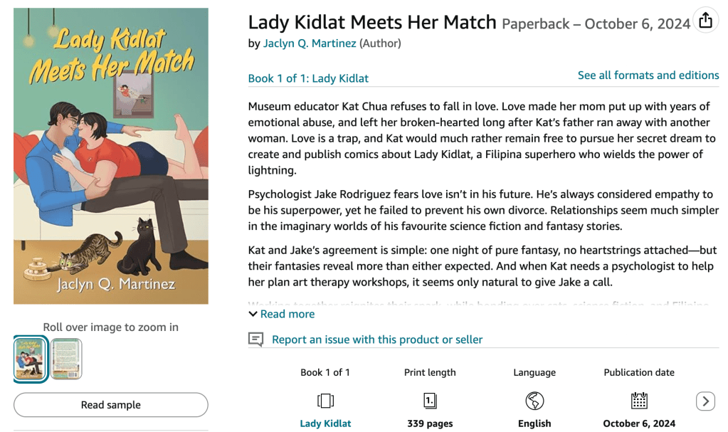 Museum educator Kat Chua refuses to fall in love. Love made her mom put up with years of emotional abuse, and left her broken-hearted long after Kat’s father ran away with another woman. Love is a trap, and Kat would much rather remain free to pursue her secret dream to create and publish comics about Lady Kidlat, a Filipina superhero who wields the power of lightning.